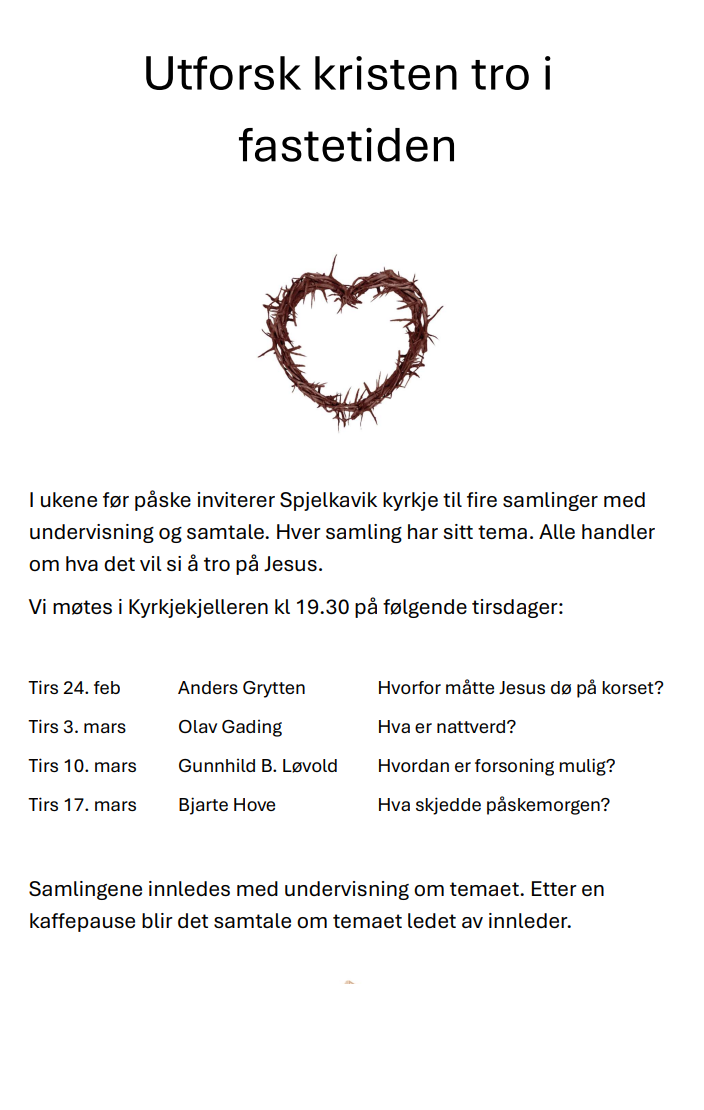 Spjelkavik kyrkje inviterer til samlinger om tro: "Hva er nattverd?", ved Olav Gading. Tirsdag 3. mars kl. 19.30 i Spjelkavik kyrkjekjeller.